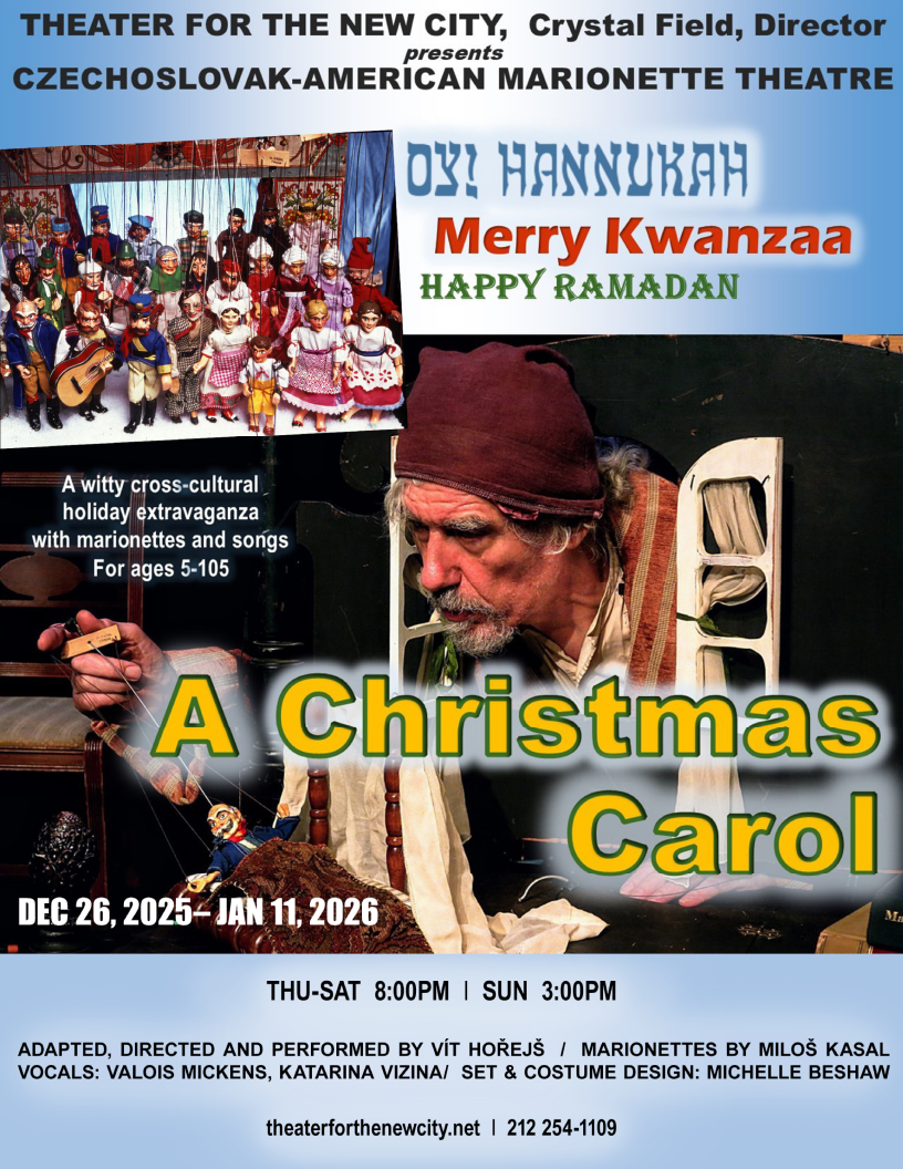 For the delight of audiences aged 5 to 105, this toy-puppet theater extravaganza is a new take on Charles Dickens’ classic with Old World accents and New World inclusiveness. Into the familiar story are woven a surprising and delightful blend of English, Jewish, African, American and Czech winter rituals, customs and holiday songs, all performed by over three dozen marionettes ranging in size from four to twenty-four inches as well as found objects and toys.