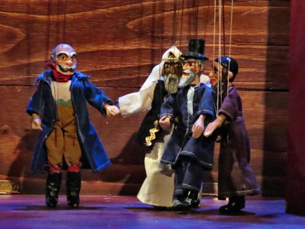 Vit Horejs operates the whole cast of puppets, backed up by a live chorus: Czech, English, Hebrew, Slovak, Spanish & Swahili songs are performed by an “a capella monumentale” choir of Valois Mickens (West African/Celtic/Native American origin) and Katarina Vizina (a transplant from Slovakia).