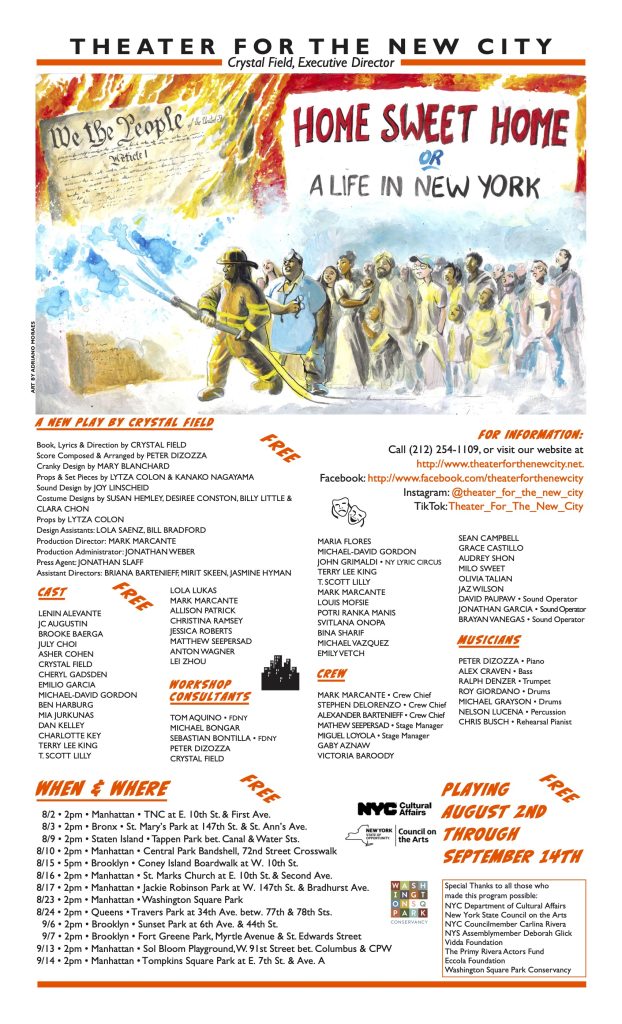 NEW YORK – Theater for the New City’s award-winning Street Theater Company will open its 2025 annual tour Saturday, August 2 with “Home Sweet Home, or A Life In New York,” a rip-roaring original musical which tells a story of a young orphan, born in America but longing to understand his roots, as deportations shake the lives of his immigrant friends. Book, lyrics and direction are by Crystal Field, Artistic Director of Theater for the New City (TNC). The musical score is composed and arranged by Peter Dizozza. Free performances will tour parks, playgrounds and closed-off streets throughout the five boroughs through September 14.