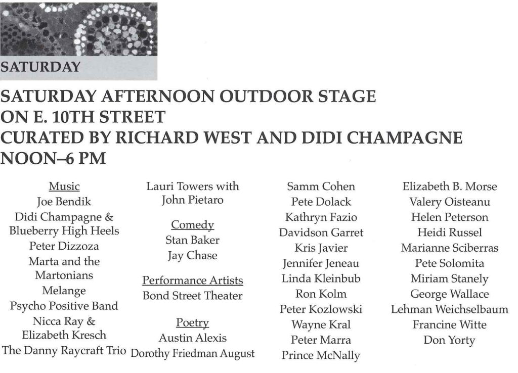 The festival has been presented annually since 1996, although in 2020 it was produced online due to pandemic concerns. A cohort of theater, dance, performance, music, film, literary and visual artists are participating on all three days. Multidisciplinary indoor performances will take stage from 6:00 PM to midnight each evening, utilizing two of TNC’s four theaters. From 10:00 AM to 5:00 PM Saturday, vendors and food sellers, including booths from nearby restaurants, will line the closed-off block of East Tenth Street between First and Second Avenues. On Saturday afternoon inside in the Johnson Theater, there will be performances by and for children, curated by T. Scott Lilly, Danielle Hauser and Miguel Loyola, emceed by John Grimaldi. A fine art show, curated by Carolyn Ratcliffe, will be hanging throughout the fest in the theater’s lobby gallery. A film program will be presented Saturday from noon to 10:00 PM in the Cabaret Theater, featuring works by auteurs from the Lower East Side/East Village along with works that reflect the essence of the neighborhood. Over 25 films curated by Burak Tatar will be screened, accompanied by talkbacks with a number of the film makers. On Saturday from 1:00 PM to 5:00 PM, an Outdoor Stage adjoining the theater will offer music and multi-discipline performances curated by Richard West, assisted by Didi Champagne. On Sunday from 4:00 PM to 7:00 PM in TNC’s Community Theater, there will be a “Poetry Jam with Prose on the Side” curated by Lissa Moira.