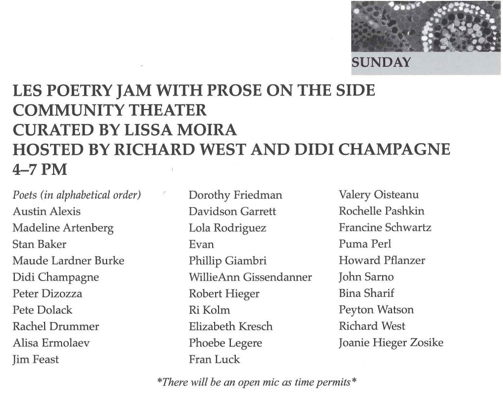 “Poetry Jam with Prose on the Side,” curated and hosted by Lissa Moira, will take stage Sunday, May 26 from 4-7pm in TNC’s Community Space Theater. Wordslingers are TBA. An open mic will follow as time permits.
