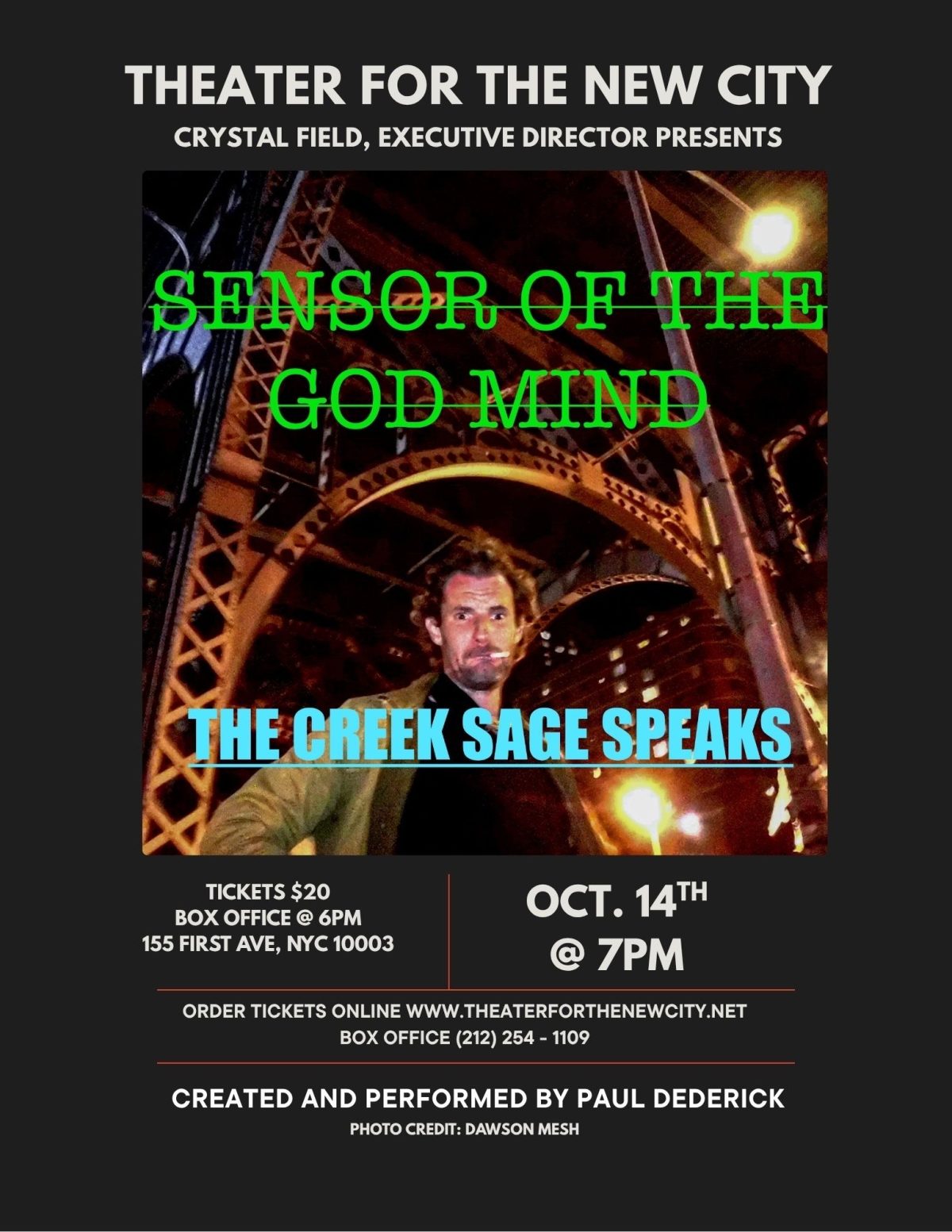 It’s called Sensor of the God Mind: The Creek Sage Speaks. It’s essentially a stand-up special/ted talk that addresses the specific questions of “what are we?” And “what is PURPOSE in this physical reality”. “How?!?”, You all scoff! -By exploring exactly that; what reality “Is”, how it’s structured: from atomic to cosmic, how we sense it to establish our perceptions of reality, and what such monolithic structures as religion, science and those that came before us lend to the discussion. Basically; we’re De-Mystifying some stuff!